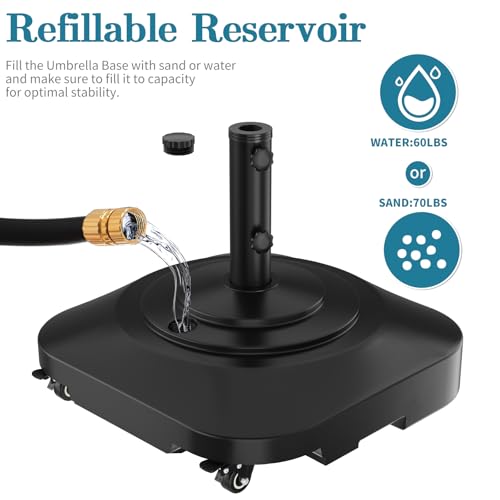 Made from heavy-duty materials, our umbrella base provides exceptional strength and durability. The reservoir can hold up to 66 pounds of sand or 40 pounds of water, offering stable support for your umbrella in any outdoor setting.